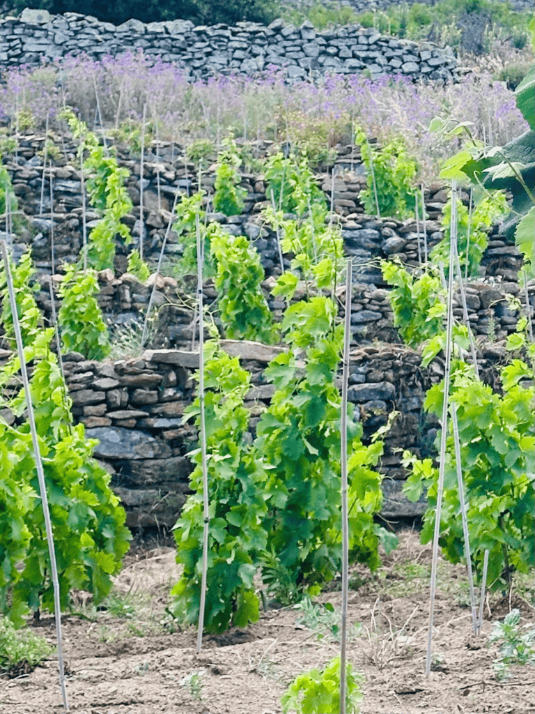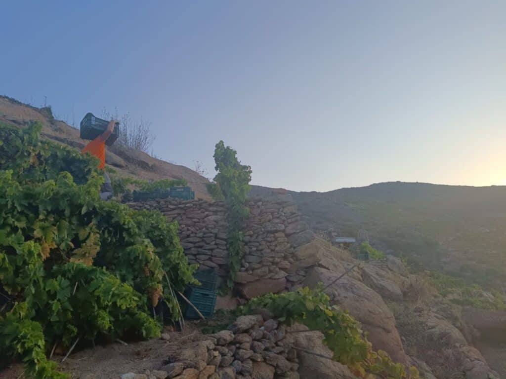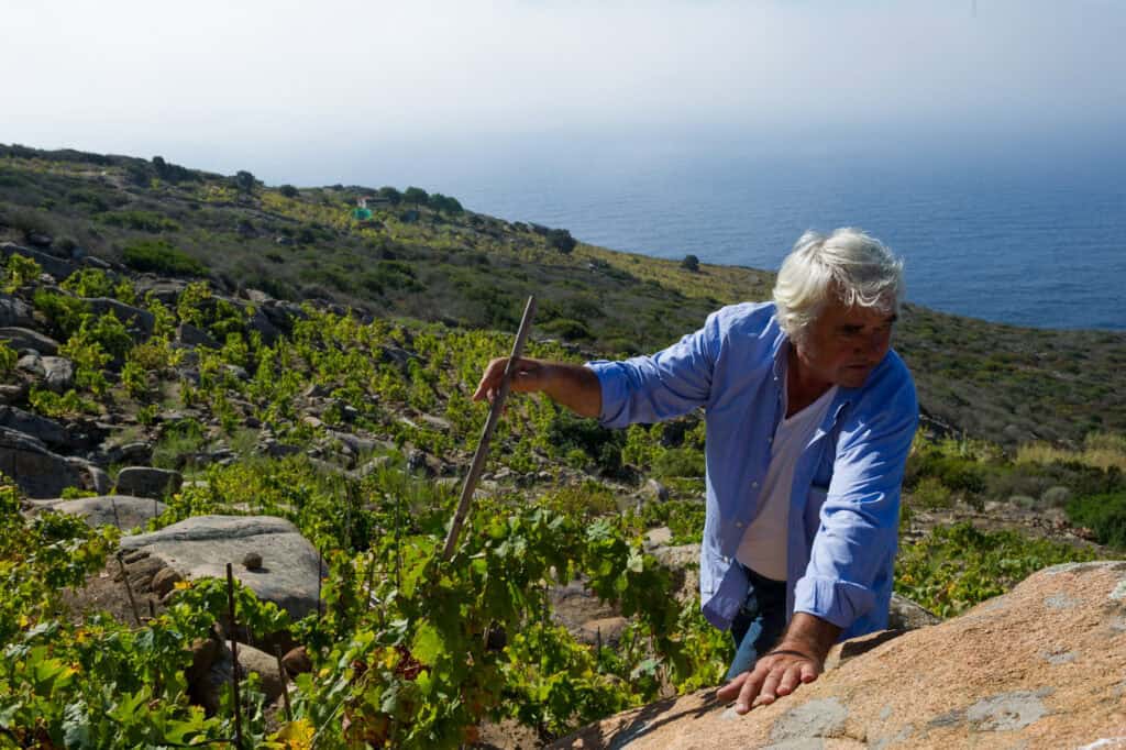 It’s accessed by hiking down the steep, rocky hill to the sprawling vineyard of spindly vines surrounded by ancient stone walls and ruins. Those stone structures and the uneven terrain make mechanization impossible, so workers use hoes and spades to work the terrain. Lacking in soil and water, the vines’ roots need to grow deep into the hematite- and granitic-rock-laden soil, so constant care is needed to break up the hard earth. “We’ve had to rediscover ancient methods, using dry stone aqueducts to capture the little rain that falls, ensuring we have water for the vines,” Cosimo explained.